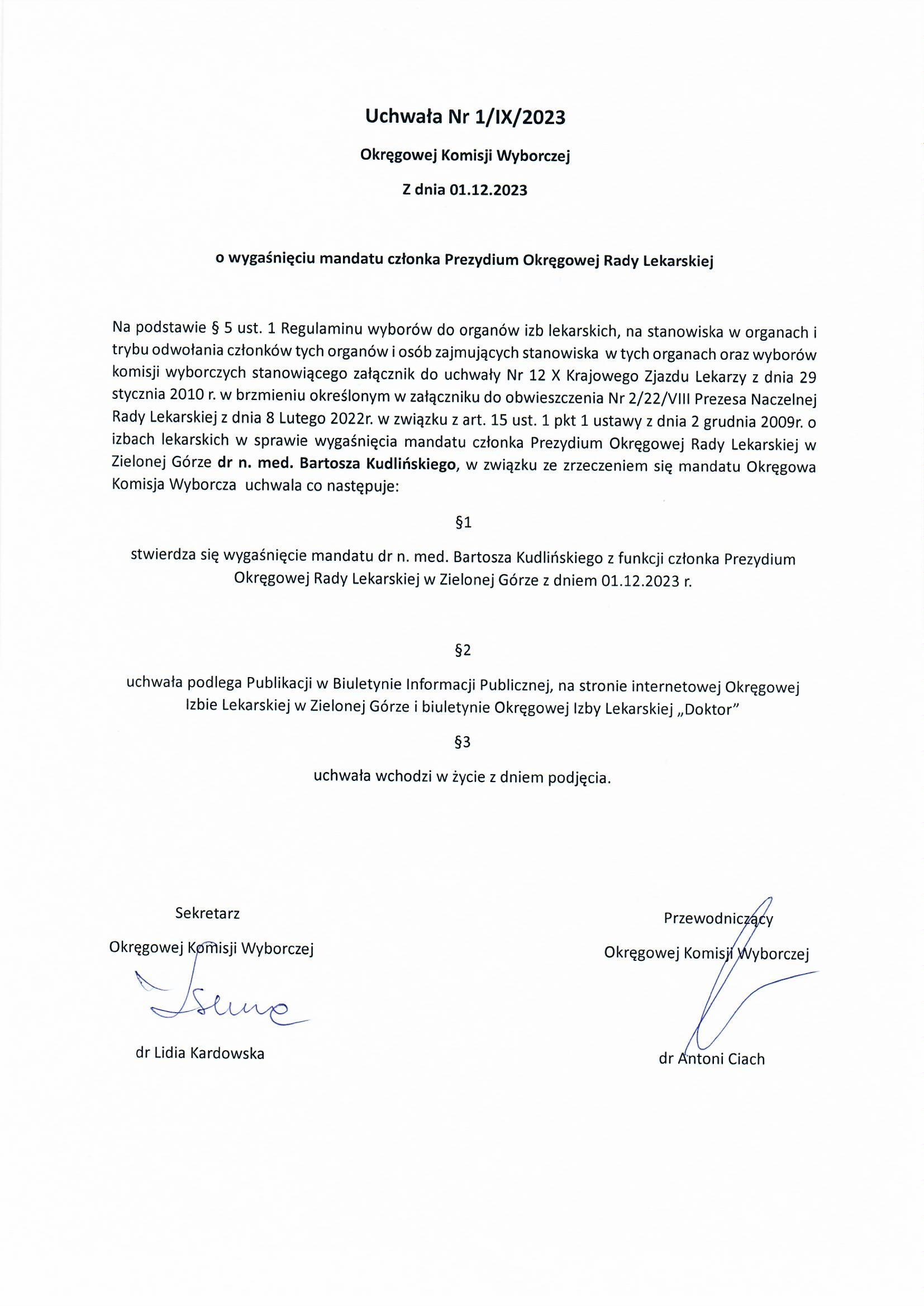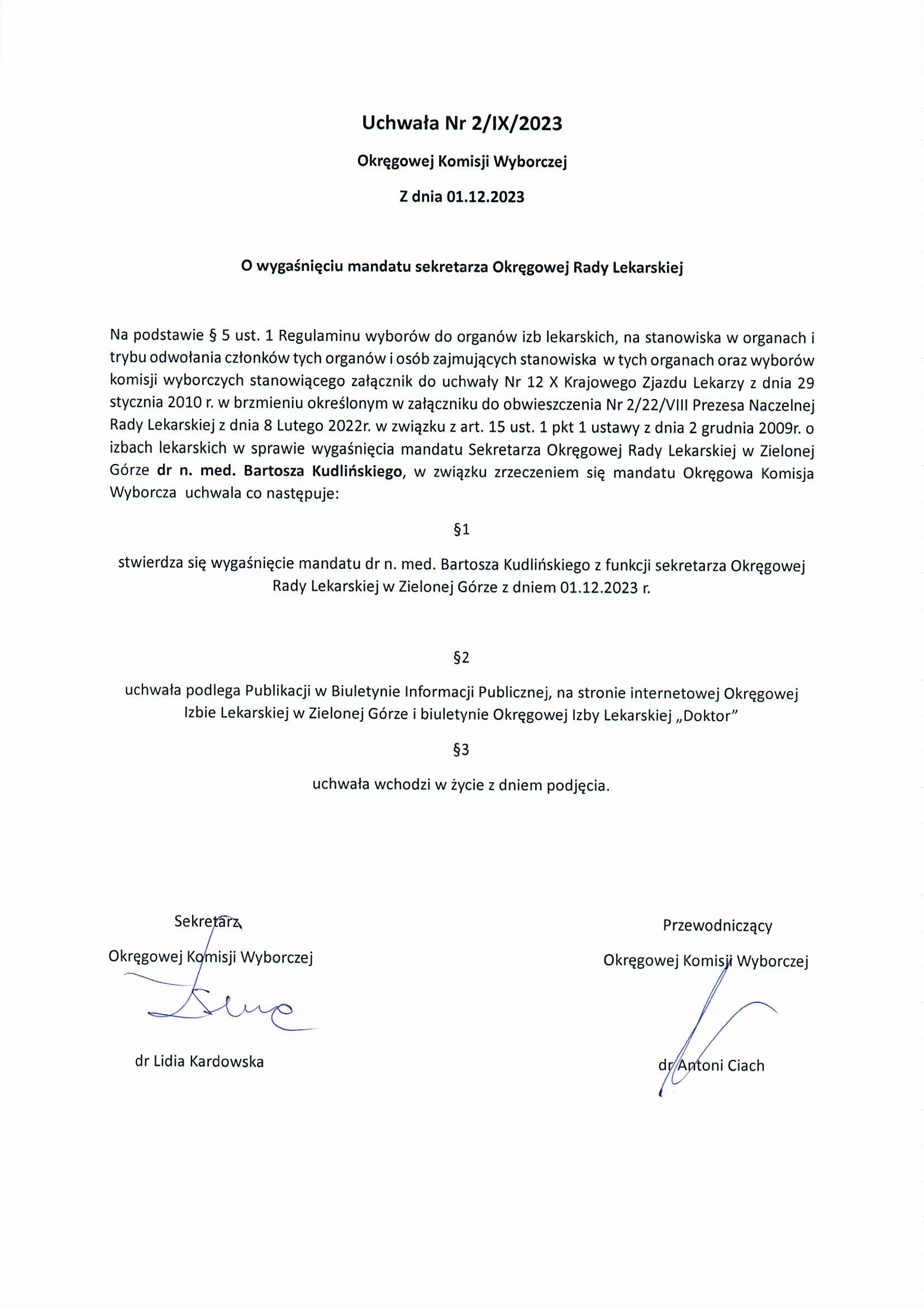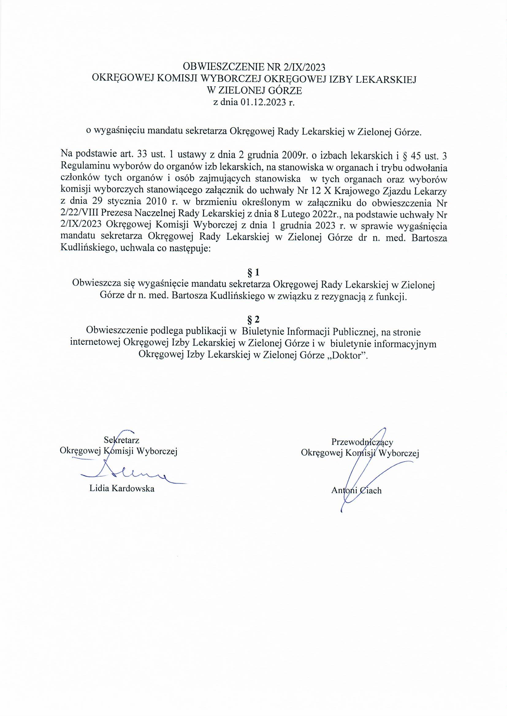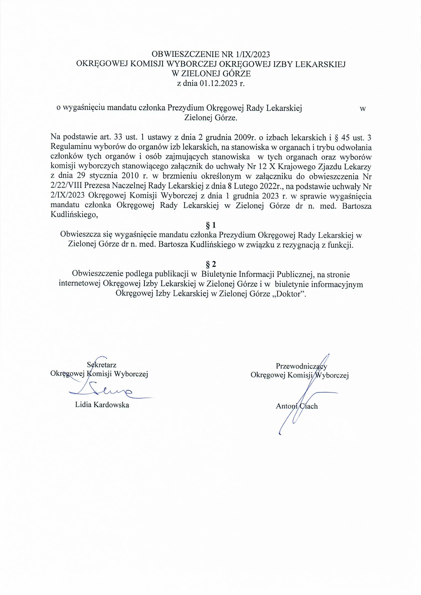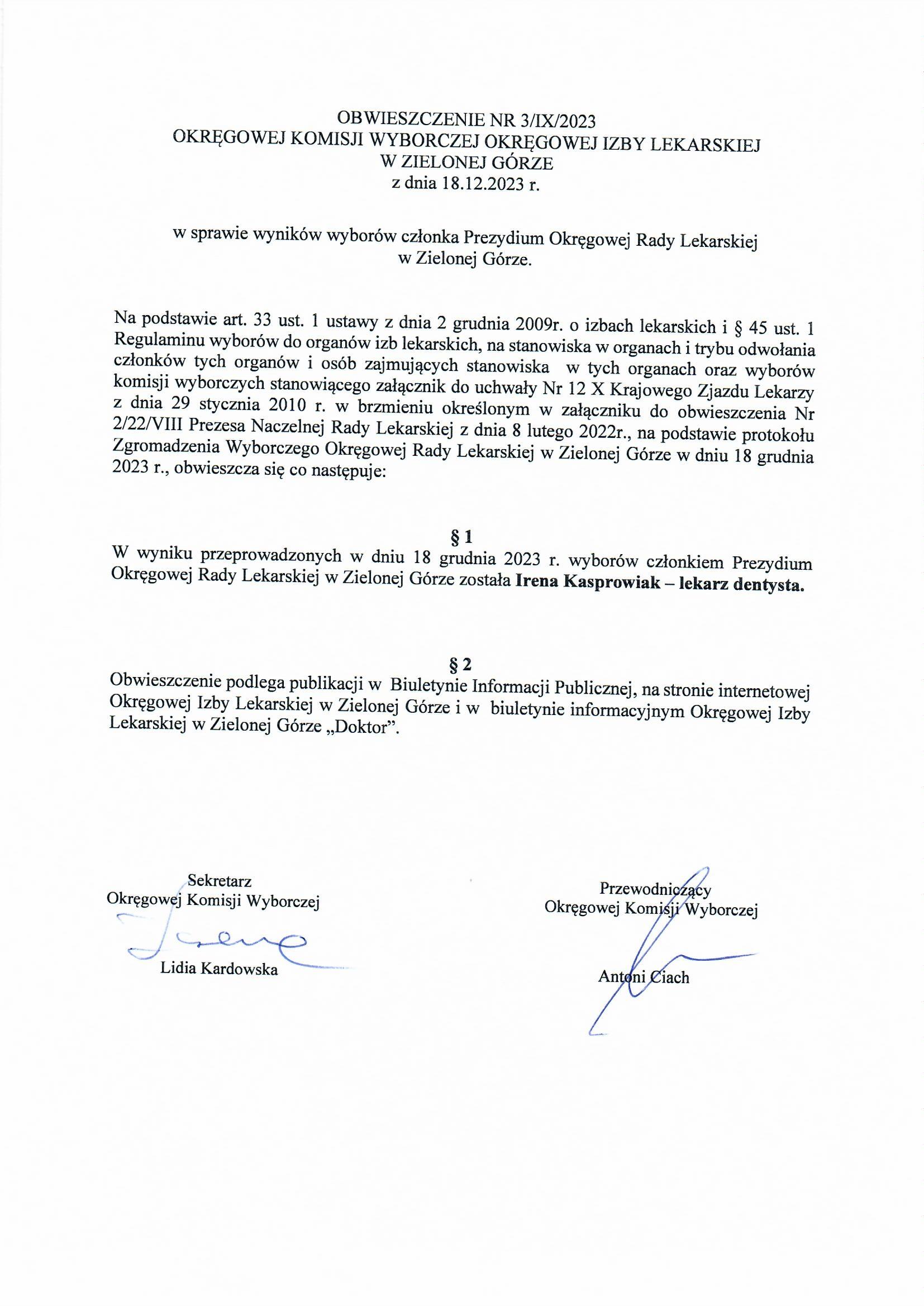 OBWIESZCZENIE Okręgowej Komisji Wyborczej Okręgowej Izby Lekarskiej w Zielonej Górze z dnia 15 grudnia 2021 r.